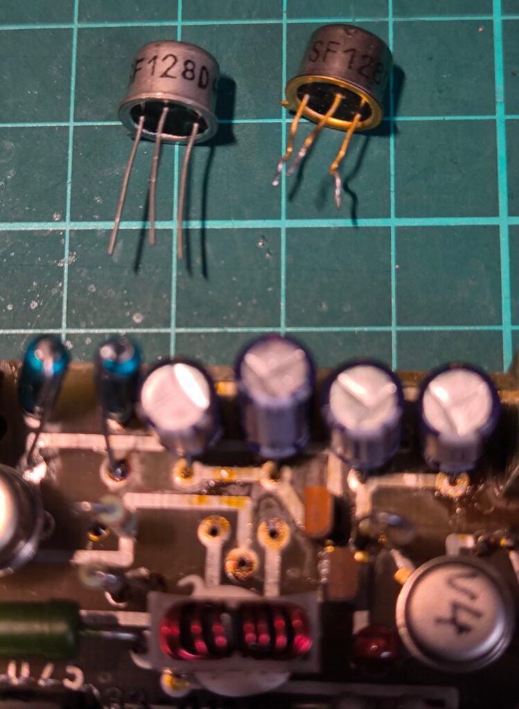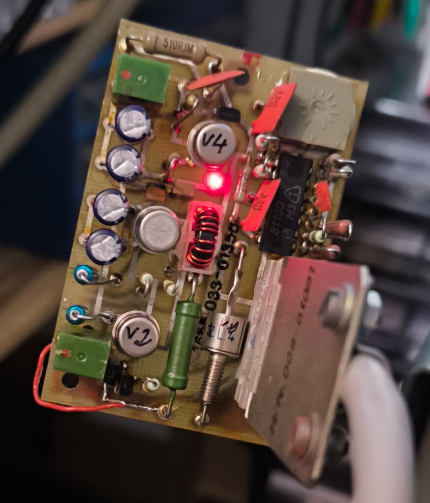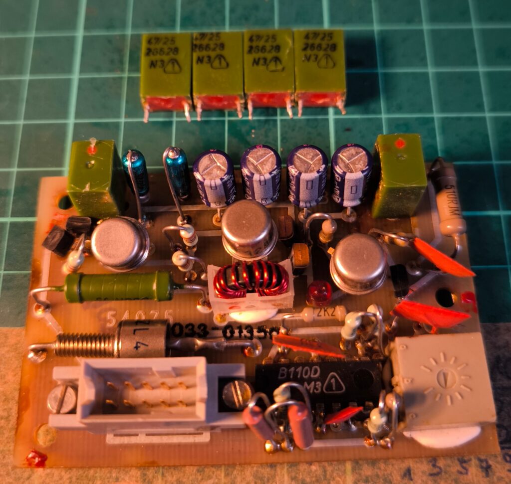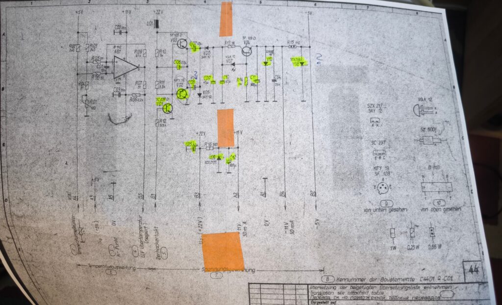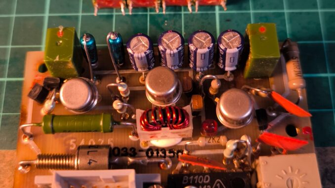 Wir trennten an verschiedenen Stellen die Schaltung zum Messen auf, tauschten zwei Elkos, aber fanden den Fehler nicht. Leider kommt man nicht all zu weit, wenn man versucht, die Temperaturüberwachung mittels externem Netzteil (22 V) mit Strombegrenzung zu betreiben, denn ohne Zerhackertakt (TTL-Pegel, ca. 430 – 480 Hz) arbeitet die Schaltung nicht. An dieser Stelle wieder mein ganz besonderer Dank an Jörg, DL3TO, für den Hinweis! Leider konnte ich mit meinem Pocket-Oszilloskop entweder messen oder einen Takt generieren, womit die externe Beschaltung (und gleichzeitige Messung) nicht möglich war. Also blieb nur ein anderer Weg: einzeln die verdächtigen Bauteile auslöten und messen. Dabei wurden zwei weitere defekte Elkos und letztendlich der defekte NPN-Transistor V03 = SF-128 D gefunden und ausgetauscht.